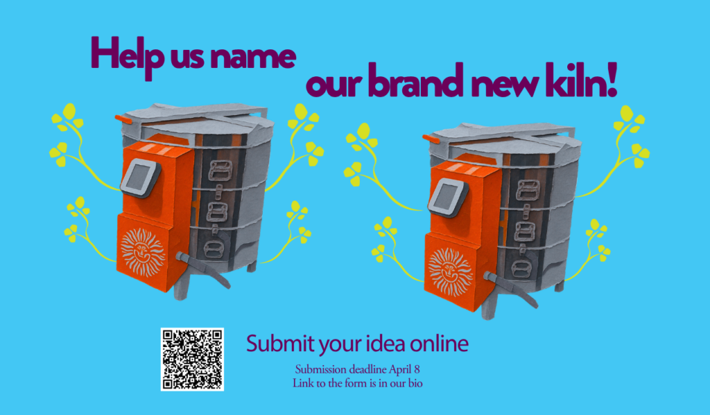 In many Ceramics studios it’s a tradition to christen a new kiln by naming it, and we invite the community to contribute unique names for the new kiln. The name suggestion form will be open until Wednesday, April 8th. The top names will be put to a vote on our Instagram page soon after. Make sure to follow us to stay up to date on the naming process.