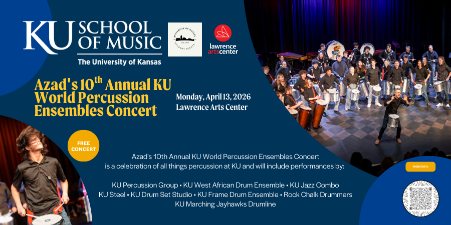 Azad’s 10th Annual KU World Percussion Ensembles Concert is a celebration of all things percussion at KU and a celebration of the amazing K.R. Azad. This concert will include performances by: KU Percussion Group; KU West African Drum Ensemble; KU Jazz Combo; KU Steel; KU Drum Set Studio; KU Frame Drum Ensemble;  Rock Chalk Drummers; and the KU Marching Jayhawks Drumline.