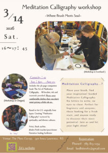 Japanese calligraphy is a culture in pursuit of perfectly beautiful characters. In this pursuit of beauty, emphasis is placed on the results. However, in Eri’s eyes, calligraphy is much more than that. There is something more significant than the results. Calligraphy is the way to meditation. In the moment that you connect with the movement of the brush, your spirit pours forth, and you feel the convergence of this life energy. The feeling of oneness between the brush and self emerges from a state of nothingness and creates the feeling of eternity in that moment. In this connection with the moment, you will touch your inner soul through unrestrained self-expression. Meditation Calligraphy is a time of reunion with yourself, yet unknown to you. Transcending time and space, the purpose of this way is to become acquainted with the forgotten inner self.