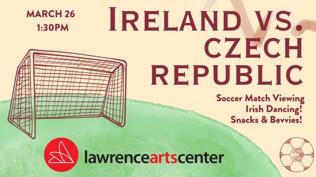 Join the LAC Irish Dancers for an in-theatre screening of the Qualifying Soccer Match between Ireland and the Czech Republic. At 1:30p, doors open for cash bar and socializing! The Irish Dancers will hype us up with a pre-game performance and Stella Comparato will share some of the in’s and out’s of how to watch a soccer game.